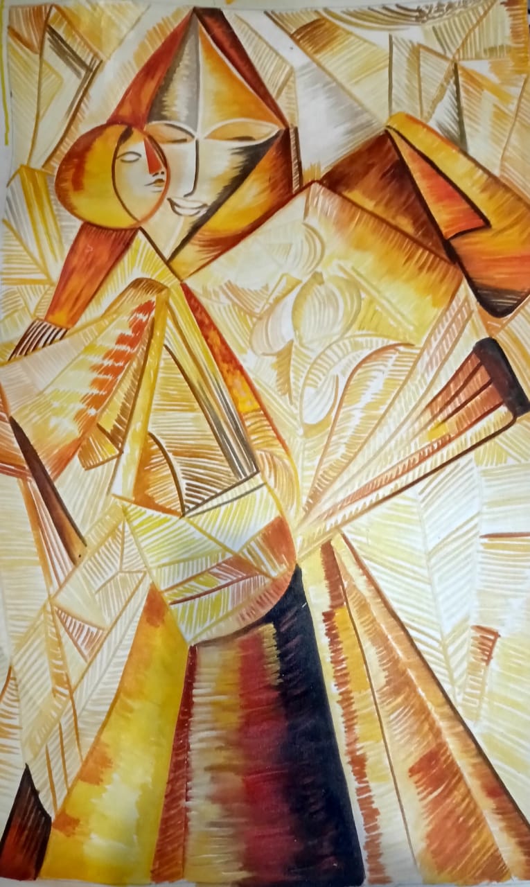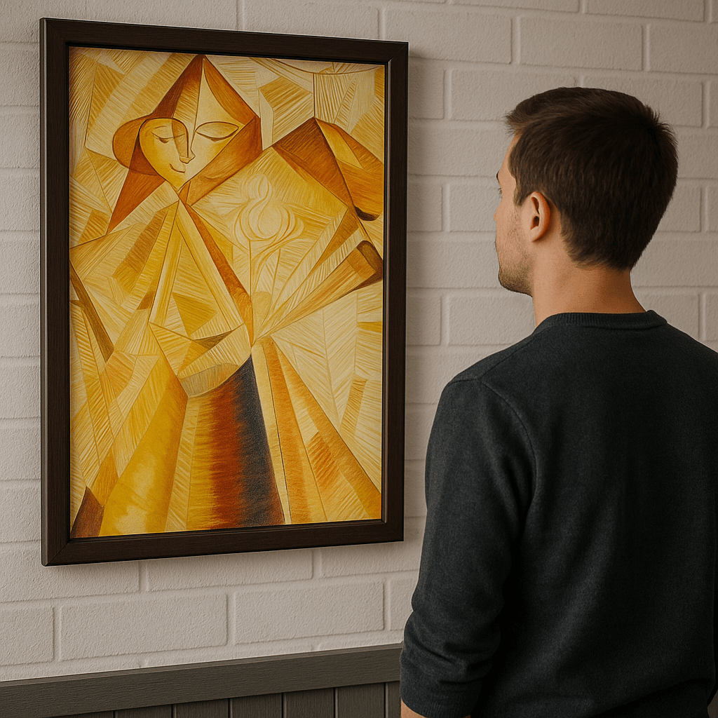 Golden Essence” is a striking exploration of form and emotion through the fragmented lens of Cubism. The piece captures the delicate balance between light and shadow, with the warm golden hues creating an atmosphere of calm and introspection. Through angular and geometric shapes, the figure begins to emerge, allowing the viewer to interpret the subject’s essence rather than focus on precise detail.